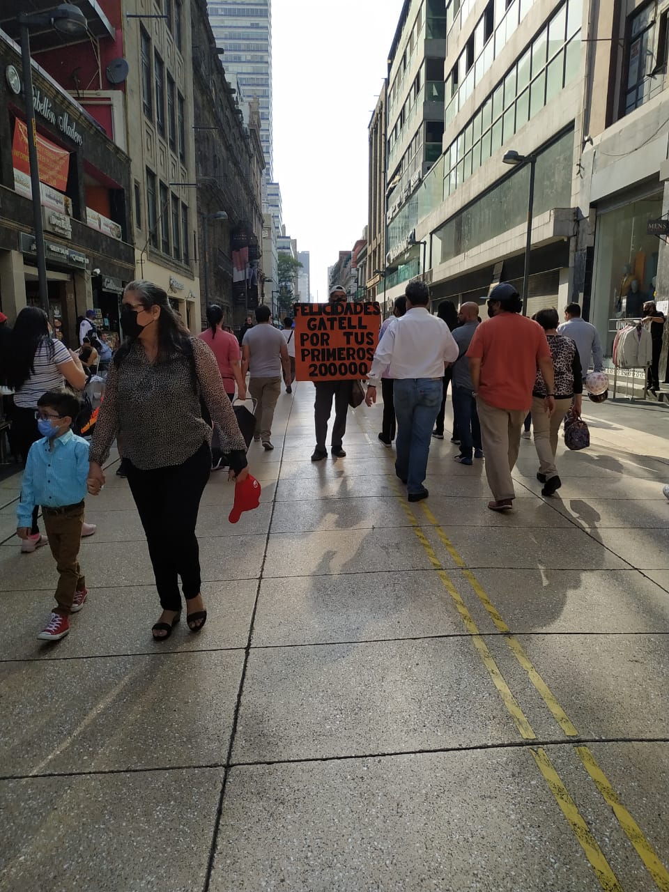 Datos generales Felicidades Gatell Fecha inicio de la fuente 2021-03-30 Fecha fin de la fuente 2021-03-30 Estado Ciudad de México Municipio Cuauhtémoc Población Colonia Centro Detalle de la fuente documental Tipo documental Fotografía documental Tipo documental ampliado Registro de campo Síntesis En la calle de Madero, durante Semana Santa, caminaba un civil que portaba un cartel con el mensaje "Felicidades Gatell por tus primeros 200,000", mientras todos a su alrededor lo leían y seguían su rumbo disfrutando de la tarde. Productor José Antonio Morales Hernández Soporte Imagen Acción principal Manifestarse en contra de la gestión de la pandemia llevada a cabo por el gobierno de México Datos del Registro Instrumento Dispositivo móvil Instrumento ampliado Cámara fotográfica de teléfono móvil Nombre de quien Registra Morales Hernández, Jose Antonio Fecha de registro 2021-03-30 Estado de Registro Ciudad de México Anexos Observaciones De quien registra:En mi opinión, dejaría la pregunta abierta sobre si ¿el mensaje va dirigido a Gatell o es sarcasmo hacía todos los paseantes en pandemia?