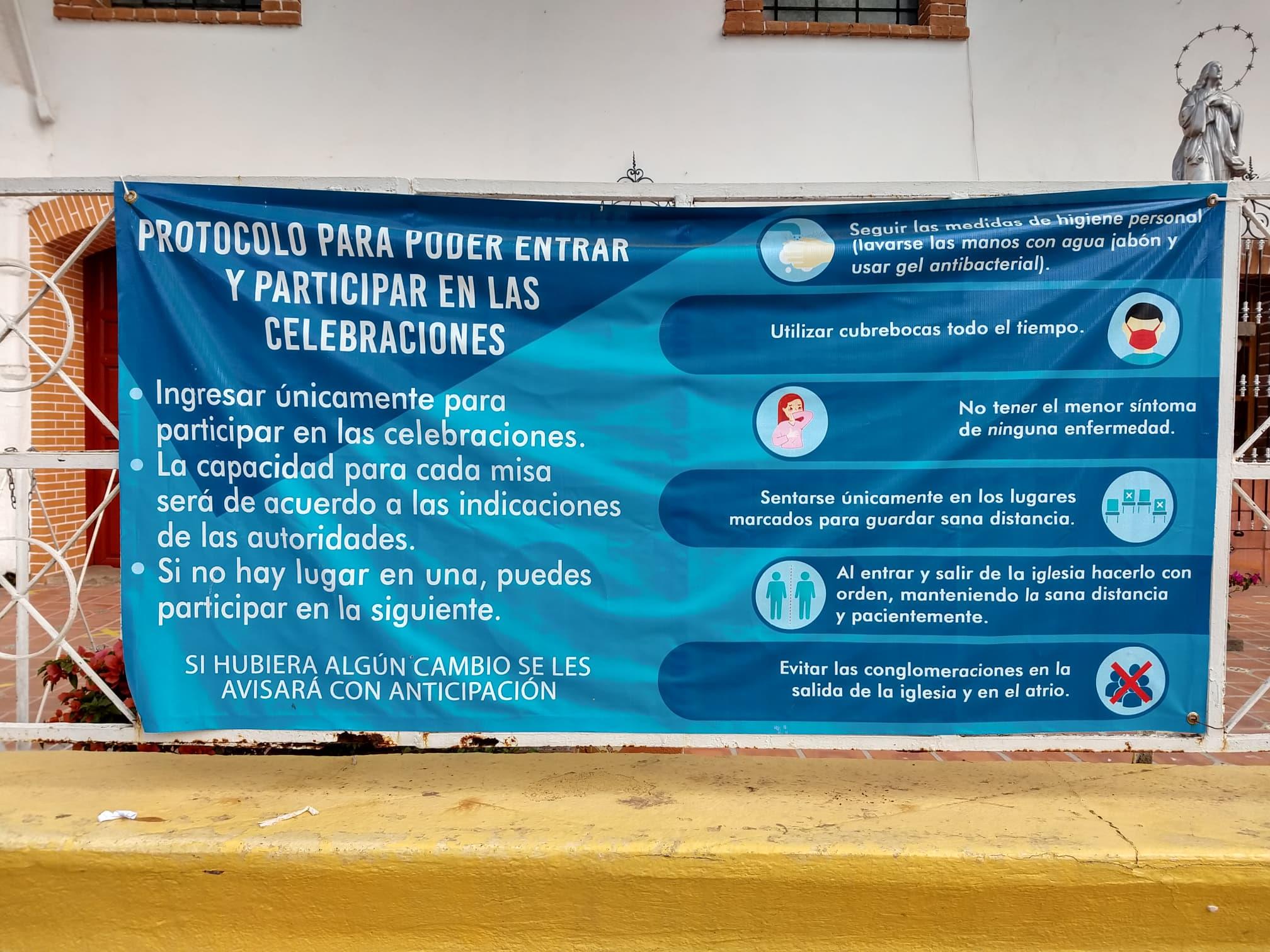 Datos generales Medidas sanitarias, Parroquia de Santiago Apóstol en Chignahuapan Fecha inicio de la fuente 2020-02-06 Fecha fin de la fuente 2020-02-06 Estado Puebla Municipio Chignahuapan Detalle de la fuente documental Tipo documental Anuncio Tipo documental ampliado Fotografía documental / Registro de campo Síntesis "Protocolo para poder entrar y participar en las celebraciones", pancarta con normativas y requisitos para el ingreso y desarrollo de ceremonias en la parroquia de Santiago Apóstol en Chignahuapan. Productor Parroquia de Santiago Apóstol en Chignahuapan Soporte Imagen Acción principal Informar a feligreses los requisitos y normativas para participar en las ceremonias religiosas Datos del Registro Instrumento Dispositivo móvil Instrumento ampliado Cámara fotográfica Nombre de quien Registra Sánchez Rodríguez, Luis Javier Fecha de registro 2020-12-06 Estado de Registro Estado de México Municipio de Registro Coacalco Anexos Observaciones De quien registra:La pancarta se encontró expuesta a un costado de las oficinas principales de la parroquia, su información podía ser vista por aquellos que recorrieran la plaza de armas del municipio.
