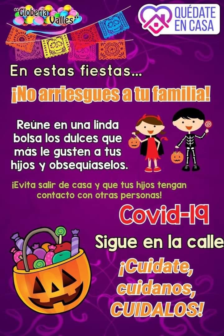 Datos generales En estas fiestas... ¡No arriesgues a tu familia¡ Fecha inicio de la fuente 2020-10-24 Fecha fin de la fuente 2020-10-24 Estado San Luis Potosí Municipio Ciudad Valles Detalle de la fuente documental Tipo documental Flyer Tipo documental ampliado Cartel digital Síntesis En el Instagram de Globería Valles, negocio dedicado a la venta de globos metálicos y de látex, decoración de eventos y globos sorpresa, se publicó un cartel digital que invita a las personas a quedarse en casa durante las celebraciones de Halloween y Día de Muertos para evitar el contagio en los menores. Productor Globería Valles Soporte Red social Soporte ampliado Instagram Acción principal Divulgar entre la población la importancia de no salir de casa durante la celebración de Día de Muertos Datos del Registro Instrumento Equipo de cómputo o Dispositivo móvil Nombre de quien Registra Álvarez Hernández, Juan Daniel Fecha de registro 2020-11-25 Estado de Registro Ciudad de México Municipio de Registro Benito Juárez Anexos Observaciones De quien registra:Por medio de una infografía que circula en la red social Instagram, se invita a no exponer a los menores puesto que, sigue vigente el virus de COVID-19.